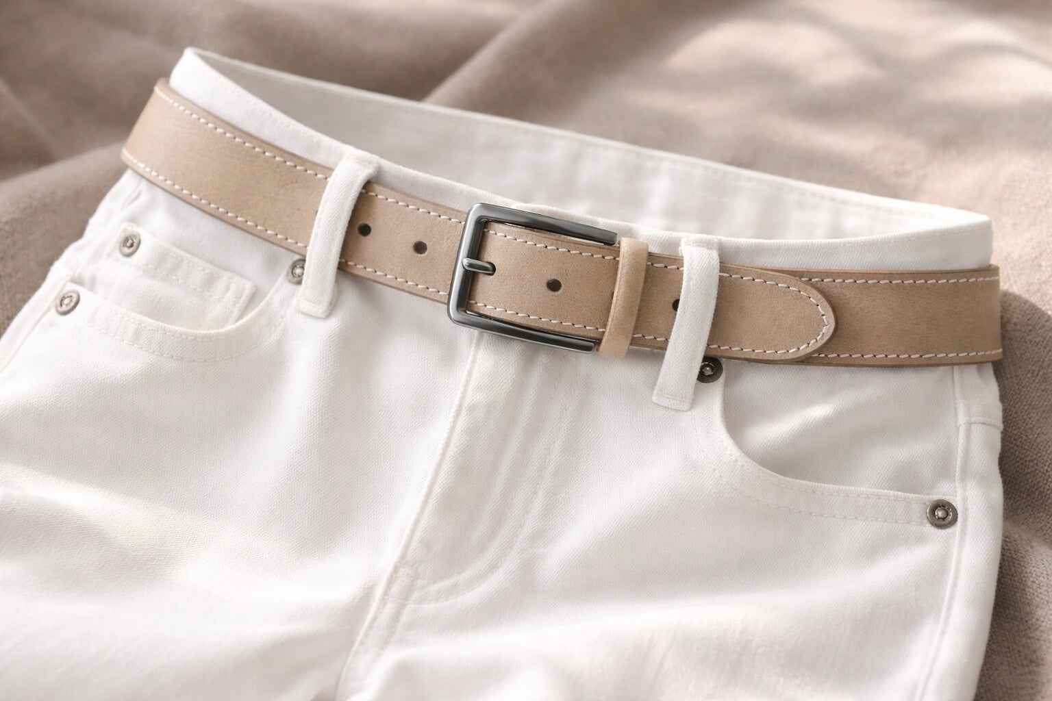 Gürtel aus pflanzlich gegerbten Leder in hellgrau mit hellgrauer Ziernaht.