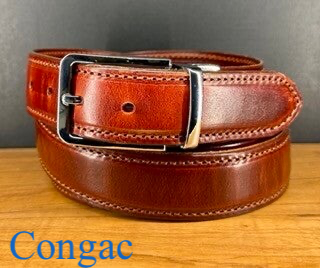 Gürtel besteht aus feinstem pflanzlich gegerbten Geschirrleder aus einer traditionellen Gerberei Norddeutschlands in der Farbe Schwarz, Cognac oder Kastanienbraun, ist ca. 34mm breit und hat eine leicht bombierte Form.