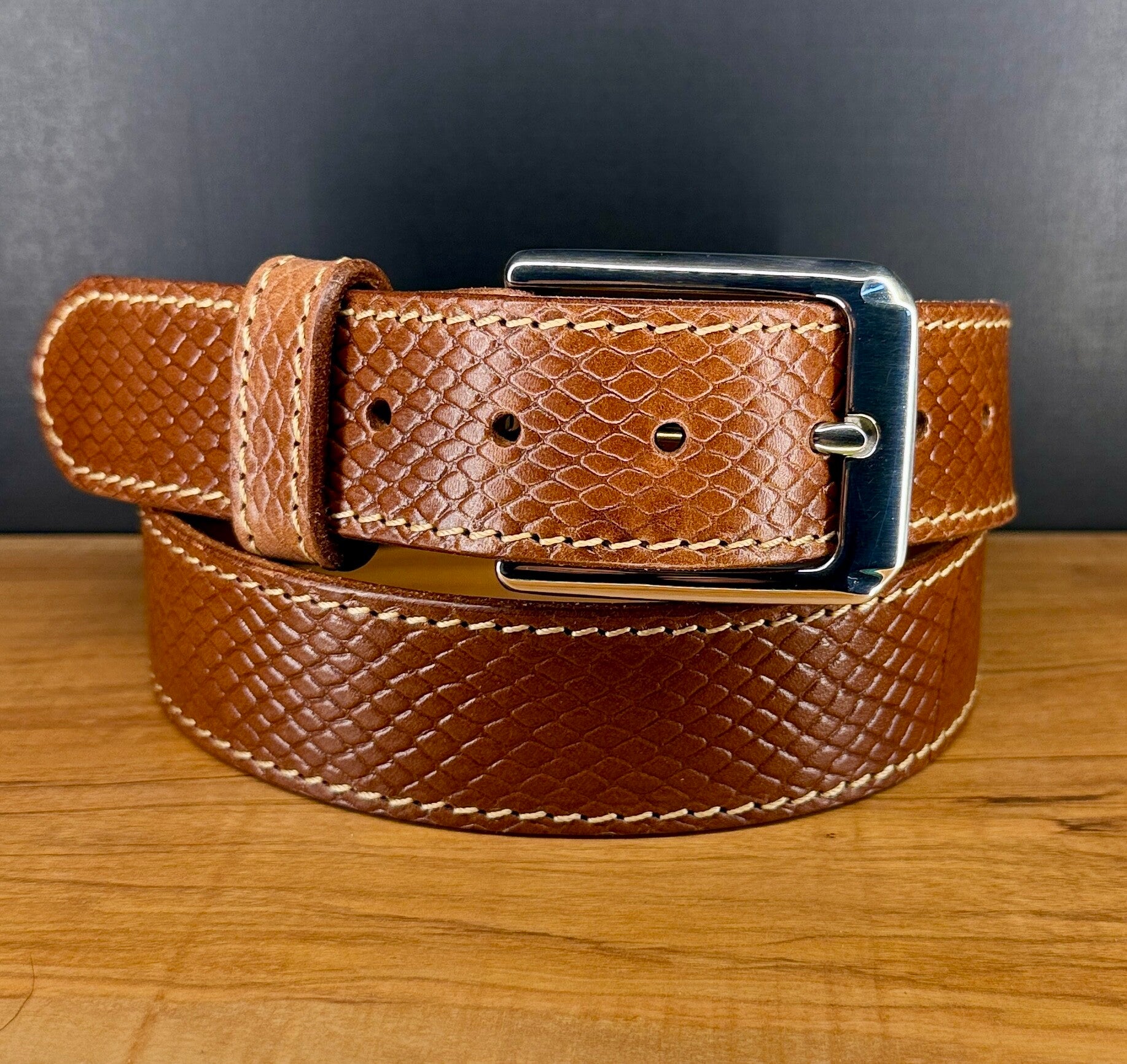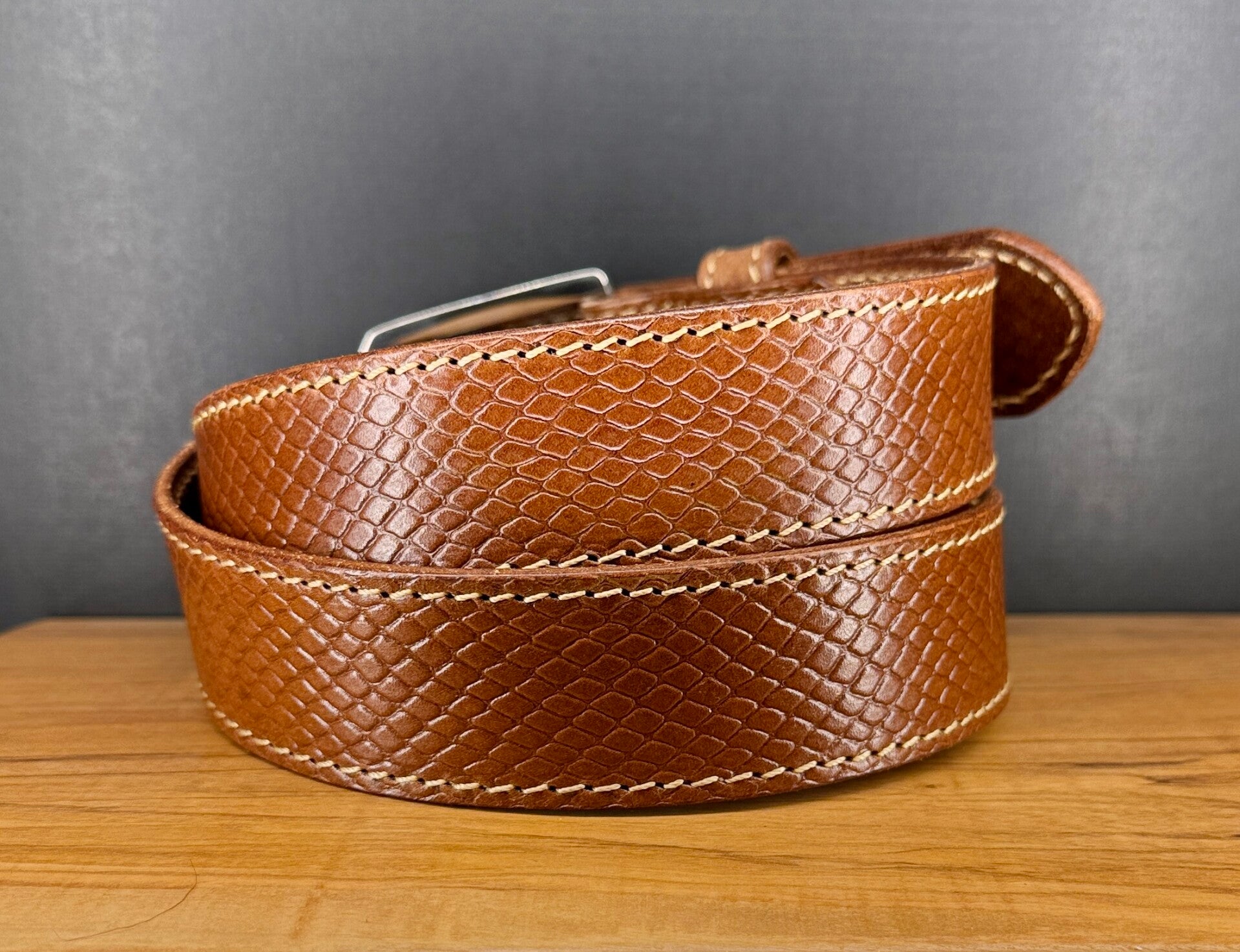 Exklusiver, handgefertigter Ledergürtel aus pflanzlich gegerbtem Leder mit edler Pythonprägung. Hellbraun mit beiger Kontrastnaht und hochwertiger Edelstahlschließe. Passend für ein Taillenmaß von 92,5–105 cm, mit 6 Löchern für optimalen Sitz. 39mm Riemenbreite ideal für Jeans, Chinos mit eleganten Freizeitlook. Ein einzigartiges Einzelstück für stilbewusste Träger.