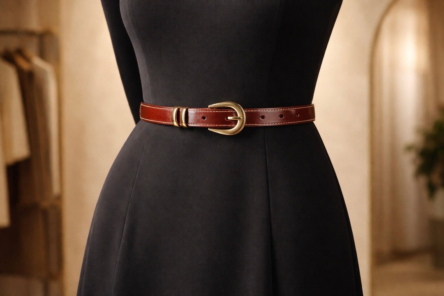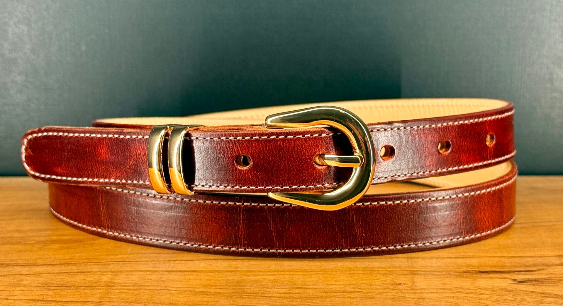 Eleganter handgefertigter Damen Gürtel aus pflanzlich gegerbtem Leder. Schmaler 2 cm Gürtel in Cognac mit goldfarbener Schnalle, passend für eine Taillenweite von 90 - 100 cm – das perfekte Accessoire für Kleider, Jeans und Business-Outfits.