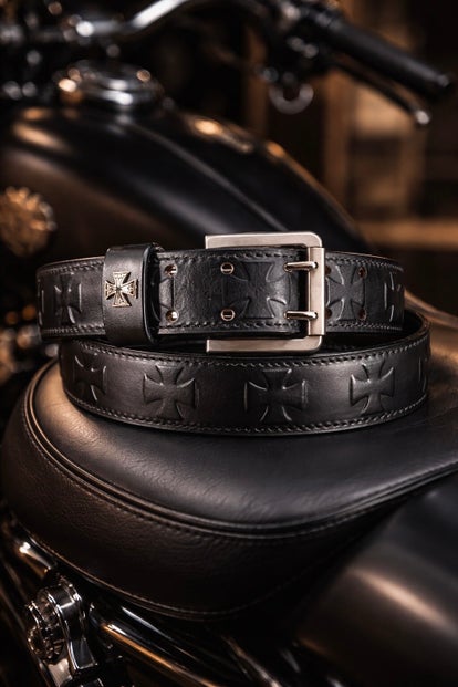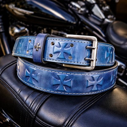 Handgefertigter Leder Biker Gürtel mit Doppeldornschließe & umlaufender Bikerkreuz-Prägung